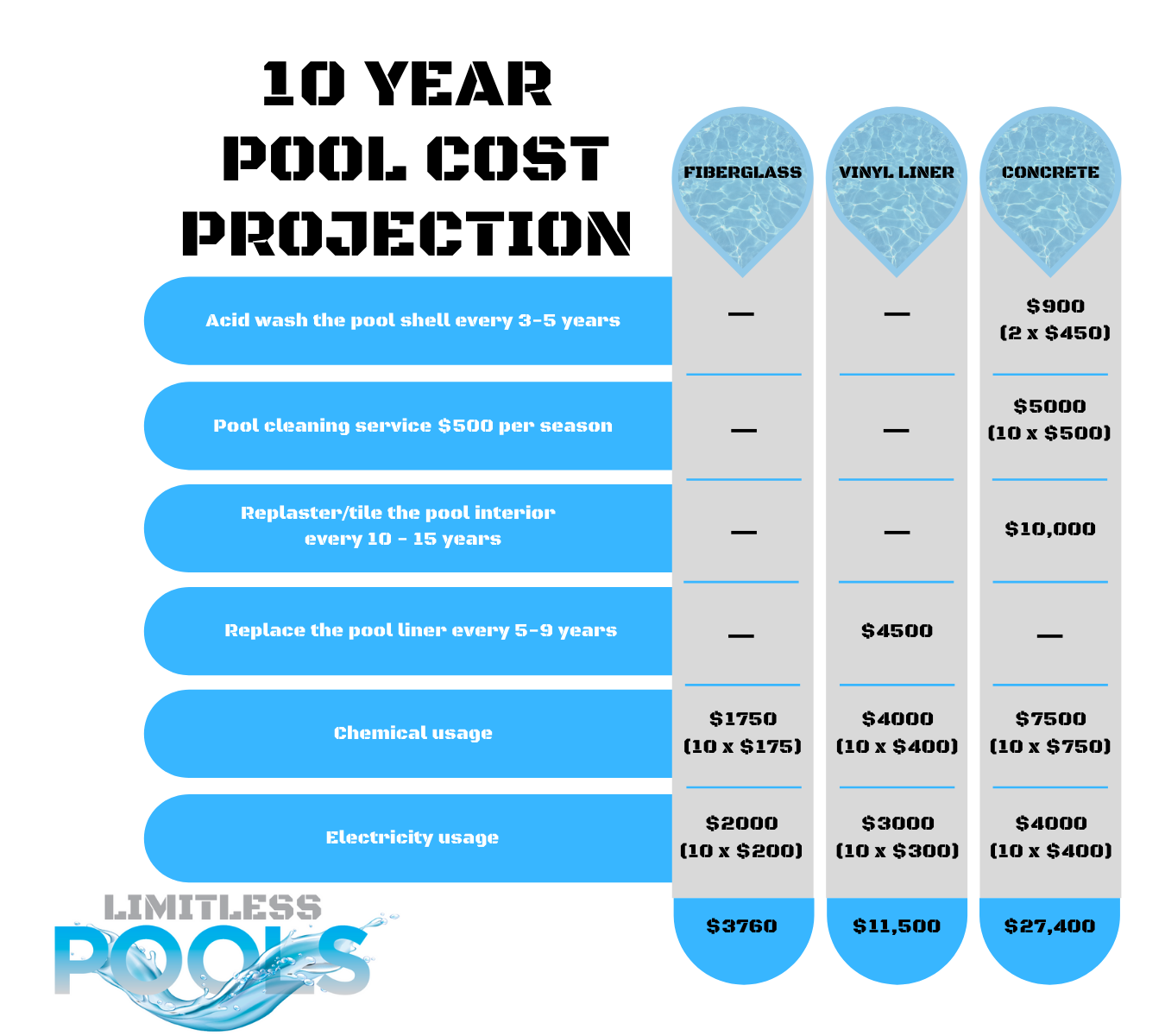 Long-term, your only serious maintenance expenses will be in chemicals and electricity. You’ll spend almost $4,000 over a ten-year period. Which is less expensive than a vinyl liner over time.